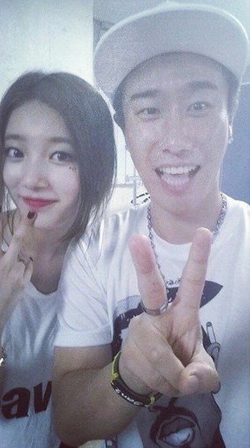 공개된 사진 속 산이는 그룹 미쓰에이 멤버 수지와 함께 웃고 있다. 산이는 브이 포즈를 취하고 있으며 수지는 또렷한 이목구비를 과시했다.