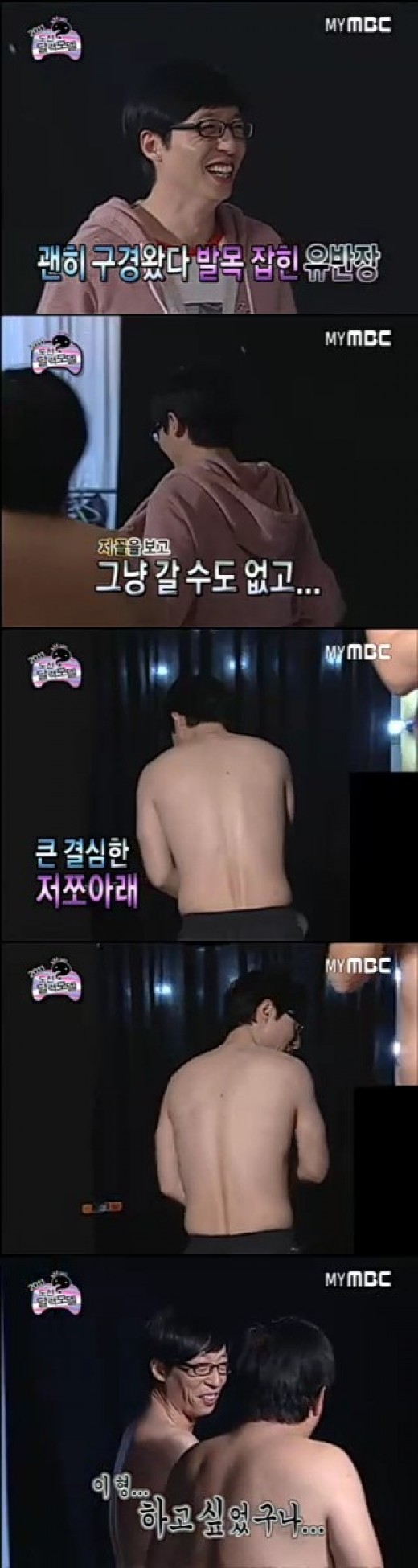 당시 방송에서 유재석은 달력사진 대결에서 2위를 거머쥐며 누드모델 면제권을 부여받았지만, 이후 누드사진 촬영장을 방문한 현장에서 멤버들의 성화에 못이겨 같이 동참을 결심하고 옷을 벗어 시청자들을 폭소케했다.