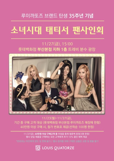 이미지 확대보기‘루이까또즈와 함께하는 소녀시대-태티서 팬사인회’는 오는 27일 오후 3시 롯데백화점 부산본점 지하 1층 트레비 분수 광장에서 열릴 예정이며, 초대권 소지자에 한해 참석이 가능하다.