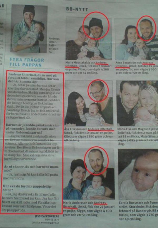 이미지 확대보기이 스웨덴 남자의 이름은 영어식으로 읽으면 ‘안드레아스 우터홀’. 그는 결혼 직전 총각 파티를 가졌는데 실수로(?) 네 명의 여성을 임신시켰다고 한다.