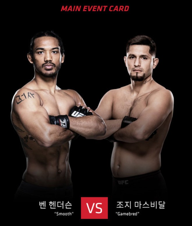 이날 메인 카드 4경기는 오후 10시부터 진행되는 가운데, 웰터급 벤 헨더슨vs조지 마스비달의 경기는 UFC 서울 마지막을 장식할 예정이다.