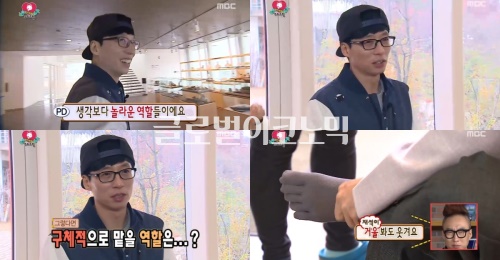 유재석은 이어 "첫 번째 연기 변신은 천재 화가다"라며 본격적인 분장에 나섰고, 화가 분장 후 보다 완벽한 캐릭터를 위해 양말을 발가락 양말로 갈아신는 듯 프로다운 면모를 보였다.
