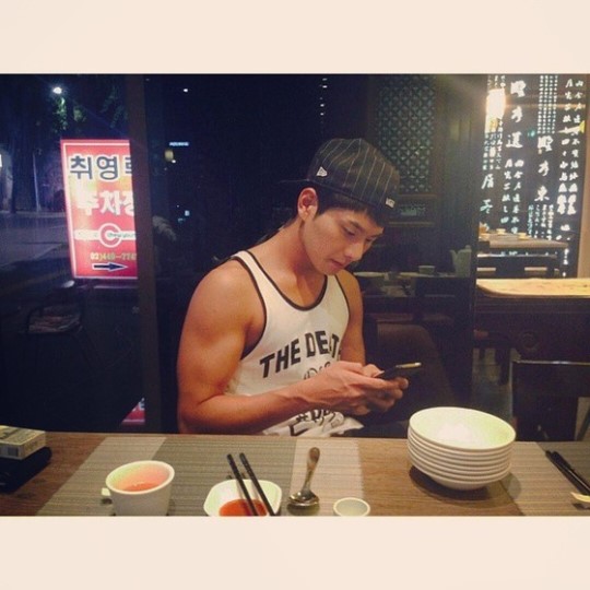 사진 속 이이경은 민소매 티셔츠를 입고 음식을 기다리는 모습이다.
