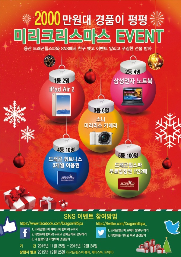 트위터로는 드래곤힐스파 트위터를 팔로우 하고 미리크리스마스 이벤트를 리트윗 하고 멘션을 달면 된다. 1등 2명에게는 iPad Air 2, 2등 4명에게는 삼성전자 노트북, 3등 6명에게는 소니 미러리스 카메라, 4등 10명에게는 드래곤 휘트니스 3개월 이용권, 5등 100명에게는 드래곤힐스파 무료입장권 2매씩을 증정한다.