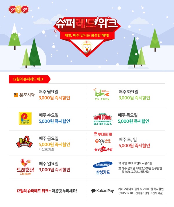 12월 슈퍼레드위크 전체스케줄은 월요일에는 '본도시락' 3000원, 화요일에는 'bhc 치킨' 3000원, 수요일에는 '피자헤븐' 5000원, 목요일에는 '파파존스' 5000원, 금요일에는 'BBQ 치킨' 5000원 할인된다. 토요일과 일요일은 보쌈, 부대찌개, 화덕족발 등 '놀부' 브랜드가 5000원, 일요일에는 '또래오래'가 3000원 할인 적용된다. 지난달에 이어 굽네치킨 신메뉴 '굽네 후르츄 소이갈릭' 매일 3000원 할인도 계속 진행된다.