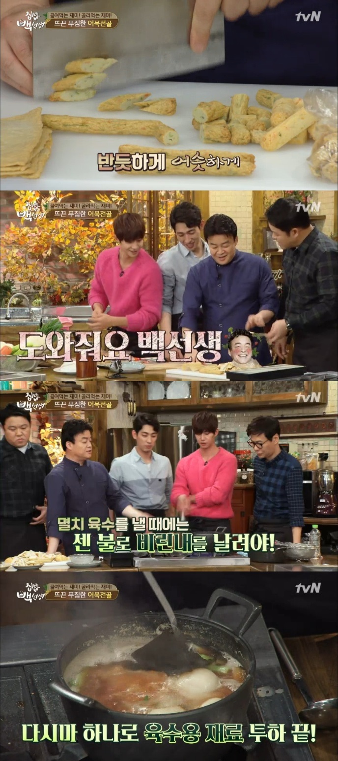 이날 백종원은 초간단 핫바, 어묵 볶음, 김&치즈 어묵구이, 어묵 말이, 어묵전골 등의 요리를 선보였다. 특히 어묵 전골은 제자 김구라, 윤상, 윤박, 송재림의 극찬을 받을 정도로 맛있게 요리돼 시청자들의 침샘을 자극했다.