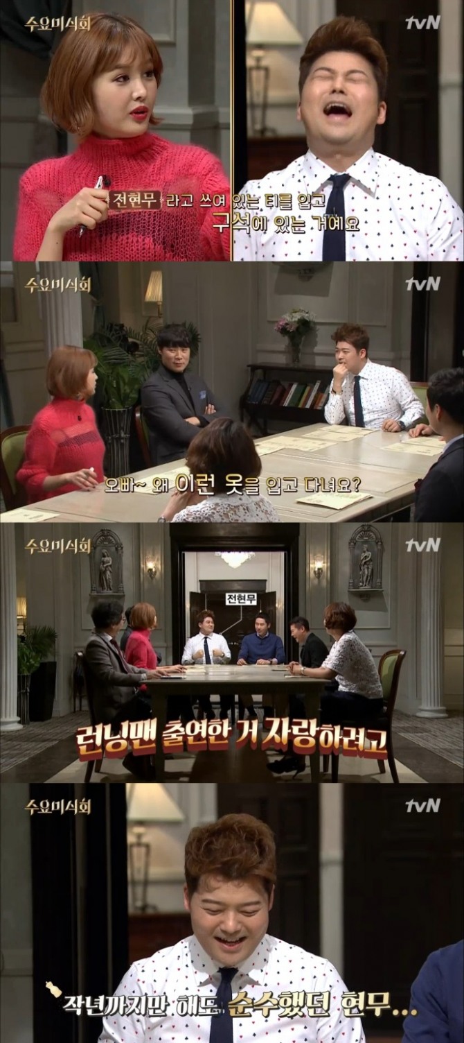 이에 MC 신동엽은 "촬영 끝나면 갈아입어야지 왜 그냥 입었냐"고 놀리자 전현무는 "그때만 해도 연예인이 된지 얼마 안돼서 런닝맨 나온 거 자랑하려고 했다. 순수하지 않냐"고 애써 포장하며 너스레를 떨었다.