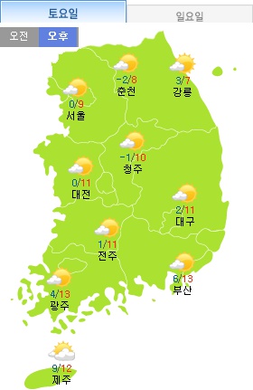 아침 최저기온은 영하 5도에서 영상 7도, 낮 최고기온은 7도에서 13도가 되겠다.