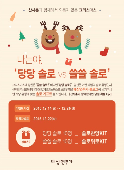 이미지 확대보기이번 이벤트는 솔로들이 '당당솔로(패기 넘치게 크리스마스를 혼자서 즐기는 솔로)'와 '쓸쓸솔로(크리스마스에 우울하고 외로움을 느끼는 솔로)' 타입 중 자신의 성향에 맞는 하나를 선택, 자신의 크리스마스 계획을 밝히면 된다.