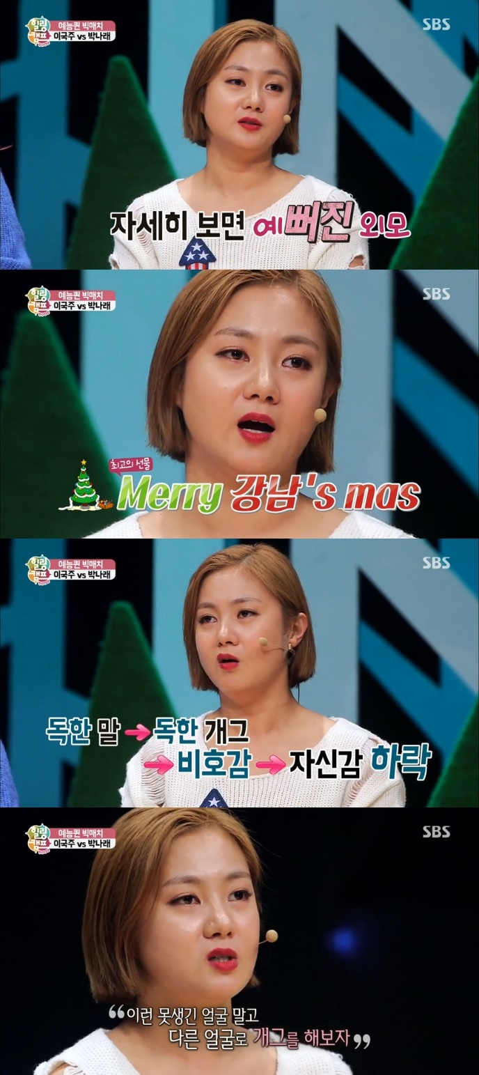 이 날 방송에서는 박나래가 성형 사실 고백과 성형을 한 이유를 털어놔 이목을 끌었다. MC 김제동이 박나래에게 "못생겼다 해서 그렇지 실제 못생기지 않았다"고 하자 박나래는 "많이 예뻐진 것"이라고 말을 바로잡았다. 이어 "저는 누가 봐도 노력형 얼굴, 강남이 만든 최고의 선물"이라며 "강남 아빠가 저를 이렇게 예쁘게 만들어주셨다"고 너스레를 떨어 웃음을 자아냈다.