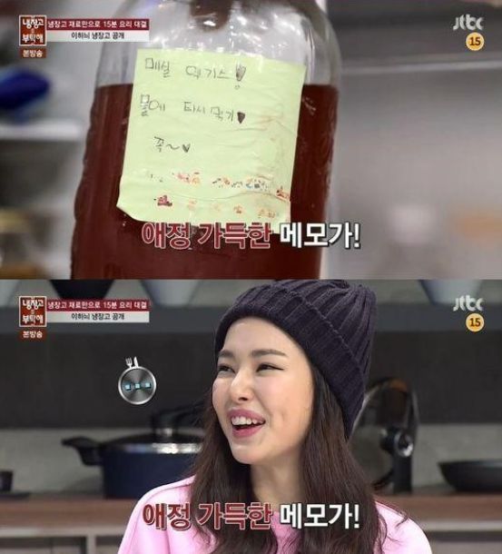 이날 방송에서 공개된 이하늬 냉장고에서 MC들은 매실액이 담긴 병에 붙어 있는 쪽지에 주목했다.