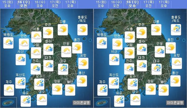 15일 기상청은 내일(16일) 날씨를 중국 북부지방에서 확장하는 찬 대륙고기압의 영향을 받겠다고 내다봤다.