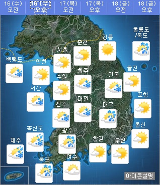 16일 기상청은 오늘(16일)의 날씨를 중국 북부지방에서 확장하는 찬 대륙고기압의 영향을 받겠다고 전망했다.
