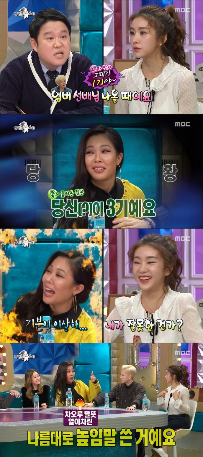 차오루는 제시를 향해 "당신이 3기다"라며 다시 정정했고, 제시는 '당신'이라는 단어가 주는 어감에 당황하는 모습을 보였다. 김구라는 "당신은 'YOU'라는 뜻"이라고 진정시켰지만 제시는 말문이 막혀 당황한 모습만 보였고, 차오루는 어리둥절한 상태에서 그 사이에 앉았던 잭슨은 두 사람을 제지했다.