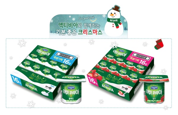 이마트에서 30일까지, 홈플러스에서는 28일까지 크리스마스 특별 상품 '떠먹는 액티비아 80g*16컵'을 할인된 가격으로 만날 수 있다. 구매 고객 전원에게는 요거트 전문기업 풀무원다논이 특별히 준비한 윈터 스티커를 증정한다.(소진 시까지)