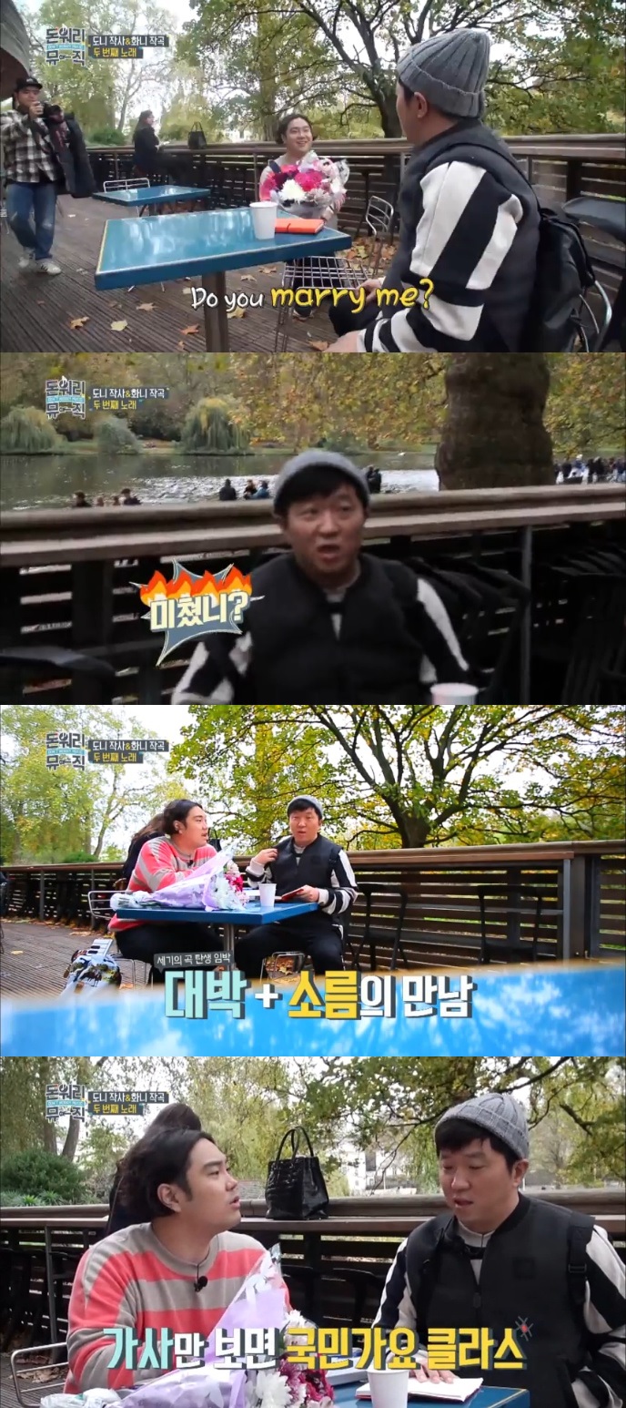 정형돈과 유재환은 본격적인 음악 이야기를 시작했다. 유재환은 혼자 돌아다니며 "정말 대박 곡이 하나 나왔다"고 자화자찬했고, 정형돈 또한 "나는 내가 쓰면서 소름 돋았다"고 한술 더 떠 폭소를 유발했다. 정형돈이 쓴 가사의 제목은 '같이 걸을까'. 제목을 듣자 유재환은 "같은 제목의 노래가 있다"며 이적의 '같이 걸을까'를 언급, 정형돈을 당황하게 만들었다.