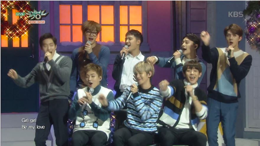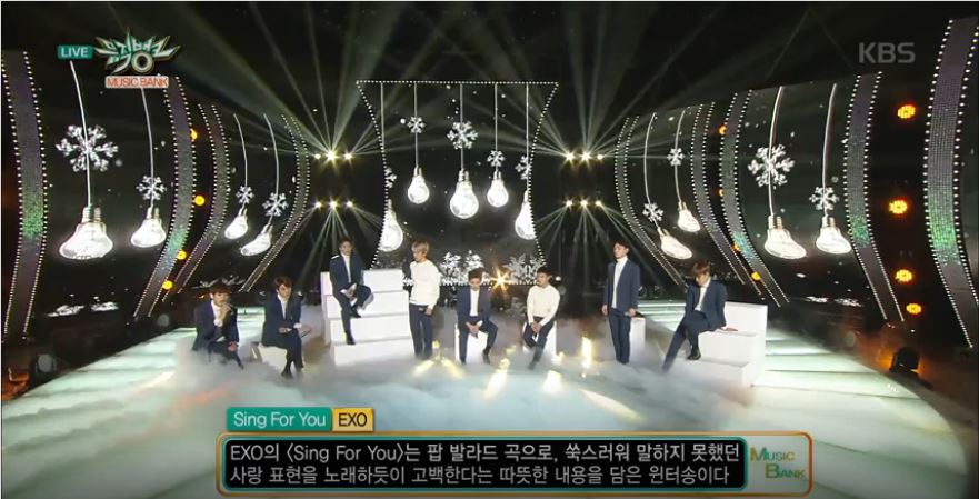 엑소는 이번 방송에서 '불공평해'를 부르기 전에 더블 타이틀곡인 '싱포유'를 먼저 불렀다. 은색 크리스마스 장식이 환상적으로 늘어진 장면을 배경으로 레이가 빠진 가운데 나머지 멤버 여덟 명 모두 앉아서 흰 터틀넥에 청색 수트를 통일해서 입고 차분하게 노래한 점이 눈길을 끌었다.
