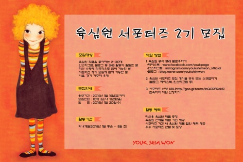 이미지 확대보기이번 서포터즈 모집은 육심원 작가의 작품을 사랑하고, SNS를 활발하게 운영하는 20~30대 남/녀 지원자를 대상으로 한다. 서포터즈를 희망하는 지원자들은 오는 22일부터 1월 15일까지 육심원 공식 블로그의 서포터즈 모집 게시글을 공유한 뒤, 참가 신청 URL에 접속하여 지원 신청서를 작성하면 된다.