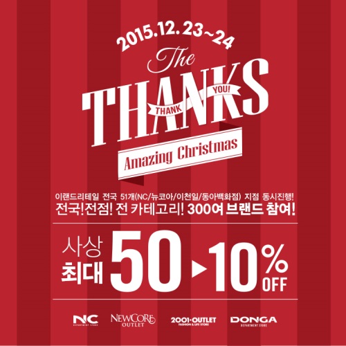 한편 이랜드리테일 크리스마스 세일 행사의 자세한 사항은 이랜드리테일 블로그와 공식 페이스북, 그리고 카카오스토리 ‘NC맘’ 검색을 통해 확인 할 수 있다.