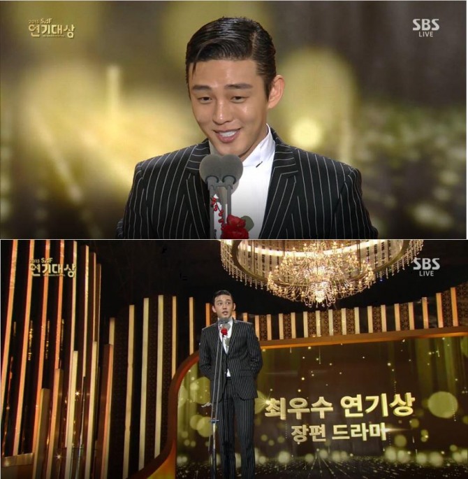이미지 확대보기지난달 31일 서울 삼성동 코엑스에서 열린 SBS '2015 SBF 연기대상'에서 유아인은 '육룡이 나르샤'로 10대 스타상, 베스트 커플상, 최우수 연기상 등 3관왕에 올랐다. 이날 사회는 유준상, 이휘재, 임지연의 사회로 진행됐다. 이날 연기대상은 '용팔이'에서 열연한 주원에게 돌아갔다.