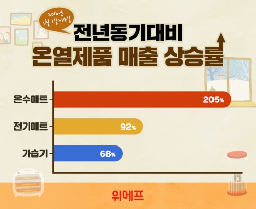 이미지 확대보기같은 기간 온수매트는 205%, 전기매트는 92%, 가습기는 68% 상승한 것으로 나타났다.