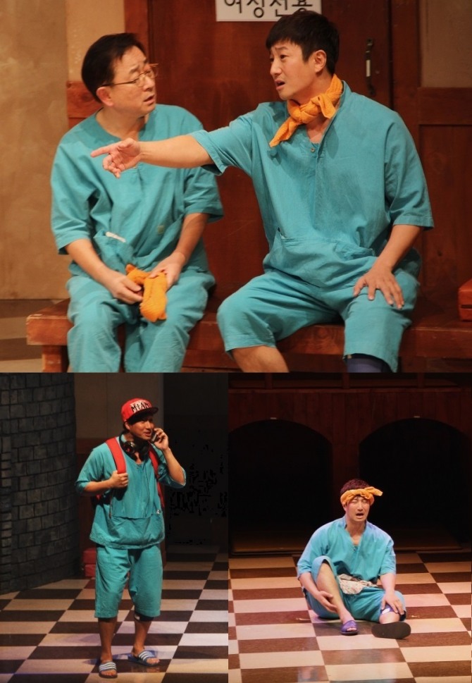 15일 연극 '여보, 나도 할 말 있어' 측이 공개한 이훈의 공연실황 사진에는 이훈이 왼쪽 무릎에 보호대를 착용하고 무대의상인 찜질복을 입고 있는 모습이 담겨있다.