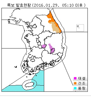 o 대설주의보 : 대구광역시, 경상북도(칠곡군, 구미시), 충청북도(영동군)