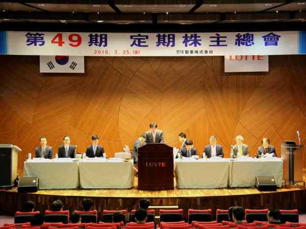롯데제과는 25일 양평동 본사 7층 대강당에서 제49기 주주총회를 열고 신동빈 롯데 회장과 김용수 롯데제과 대표를 사내이사로 재선임했다. 황각규 롯데그룹 정책본부 운영실장과 민명기 롯데제과 건과영업본부장을 사내이사로 새로 선임했다.