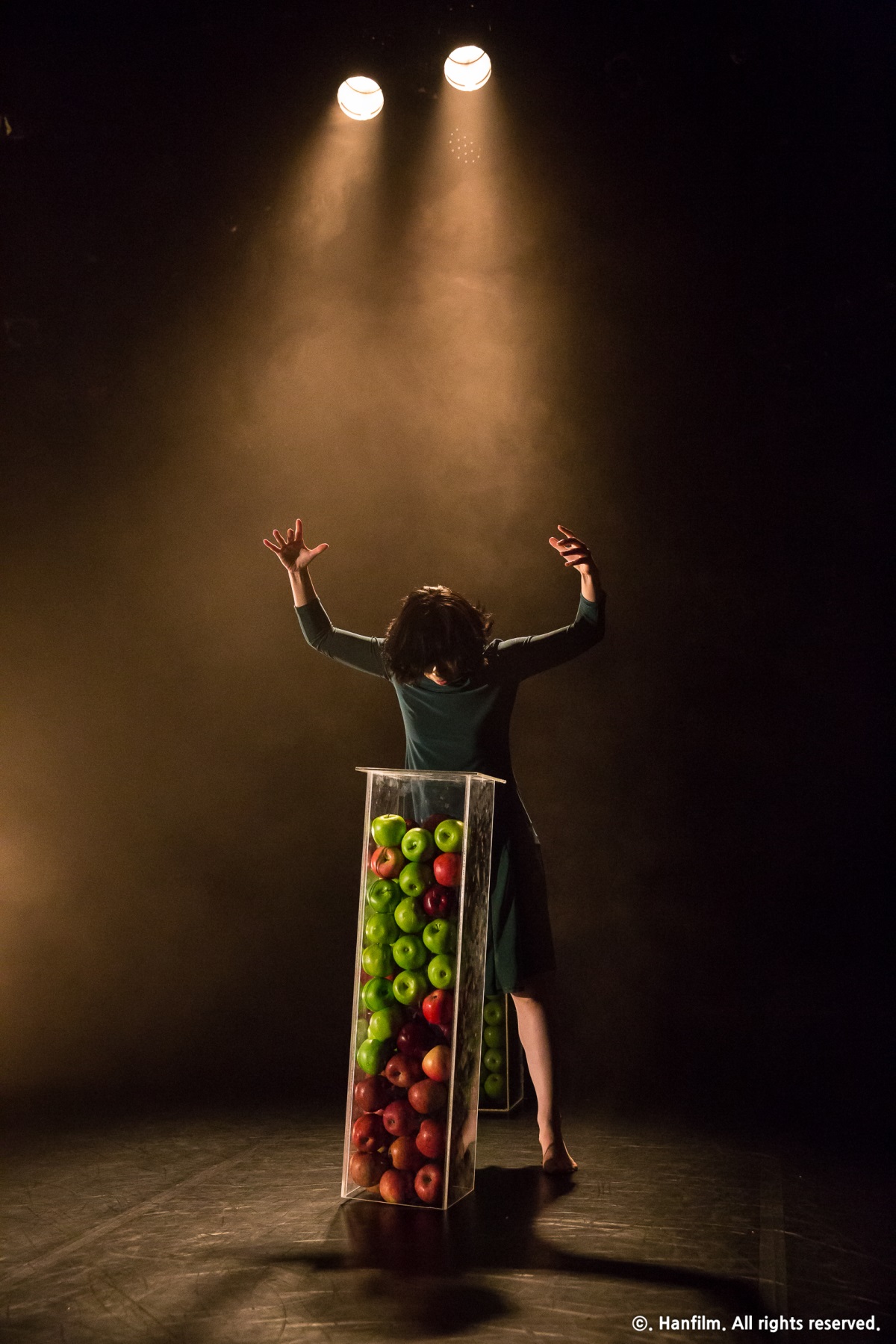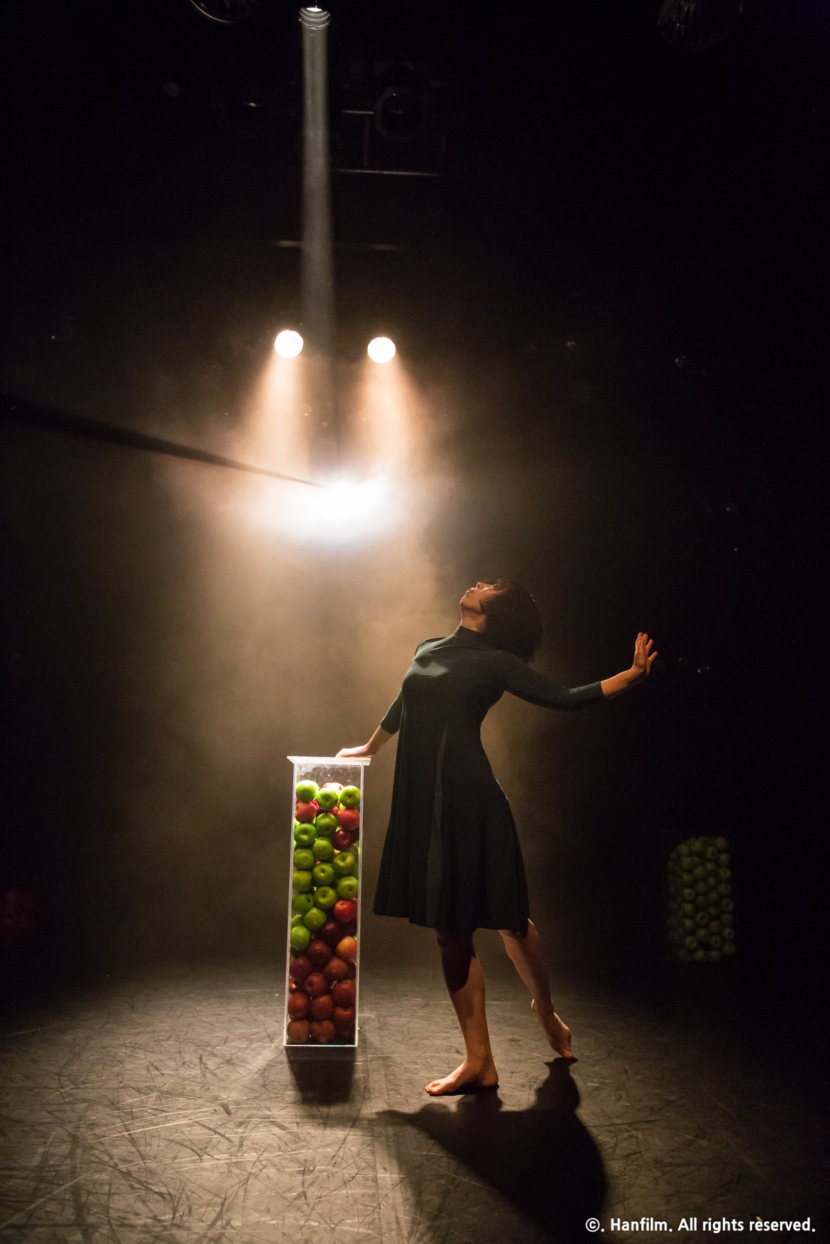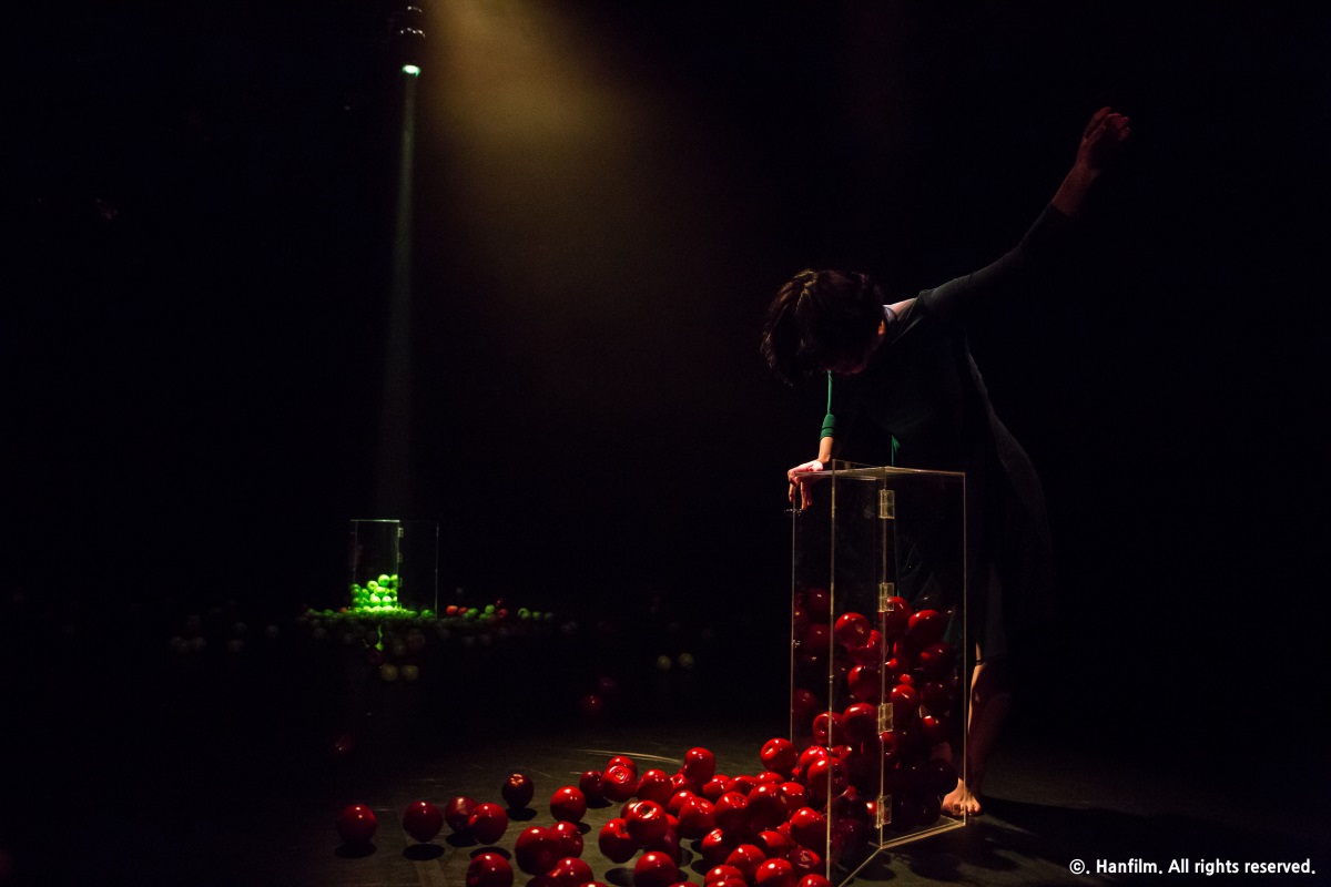 관조에서 춤을 추게 되는 여인은 자유로운 날갯짓을 가진 새들을 늘 동경해왔다. 여인은 이십대 중반의 세 여성들(자신의 과거이자 분신들) 사이의 시간이 만든 거리감, 상실감, 어느 순간 그들과 하나 되고 싶은 삶의 일체적 충동감을 사과라는 상징에 담는다. 파격은 상자 속의 사과가 바닥으로 쏟아져 내릴 때 이다. 상자위에 앉아있는 여인은 슬픔이 가득 배어있다.