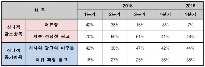 반면에 기사와 광고의 미구분, 허위‧과장 광고의 비중은 상대적으로 늘어난 것으로 분석됐다.