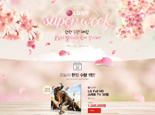먼저 6일 오전 10시부터 LG전자의 55형 Full HD LED TV(55LF6410)를 104만9000원에 50대 한정수량으로 판매하며, 7일은 드럼세탁기(트롬, FR24D7NQNZ)를 50대 한정, 71만9000원에 판매한다.