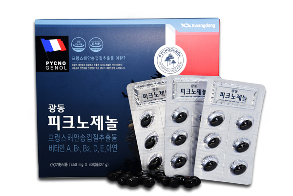 이미지 확대보기피크노제놀 성분은 프랑스 해안송 껍질 1000kg당 약 1kg을 얻을 수 있는 추출물이다. 이미 80여개 나라에서 판매되고 있는 안전성과 기능성이 입증된 성분으로 미국 FDA 원료 안전성 인증 제도인 GRAS에 등재됐고, 국내에서도 갱년기 여성의 건강에 도움을 줄 수 있어 지난해 식약처로부터 기능성을 인정받은 바 있다.