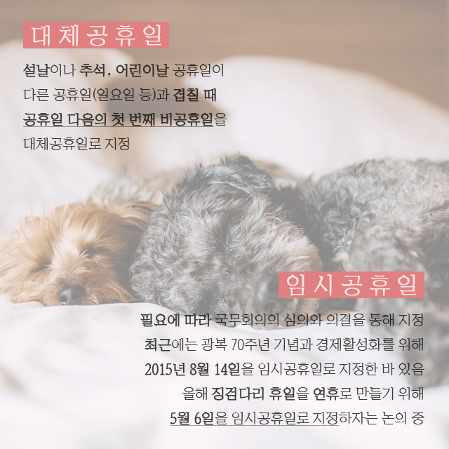 이번에 화제가 되고 있는 임시공휴일은 필요에 따라 국무회의의 심의와 의결을 통해 지정한다. 최근에는 광복 70주년 기념과 경제활성화를 위해 지난해 8월 14일을 임시공휴일로 지정한 바 있다.