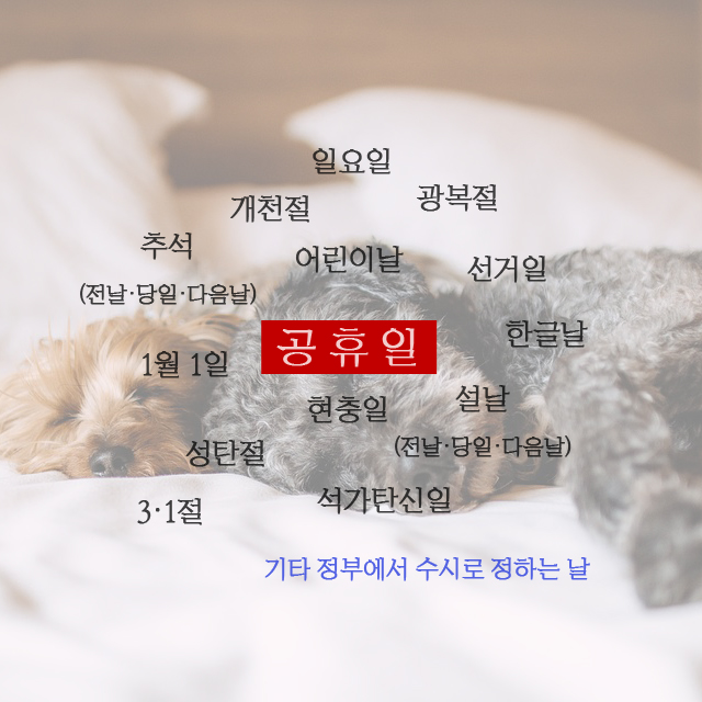 공휴일은 공적으로 휴무하기로 정한 날이다. 일요일과 3‧1절, 광복절, 개천절, 한글날 등 국경일과 1월 1일, 설날(전날‧당일‧다음날), 석가탄신일, 어린이날, 현충일, 추석(전날‧당일‧다음날), 성탄절, 선거일, 그리고 기타 정부에서 수시로 지정하는 날이 공휴일이다.