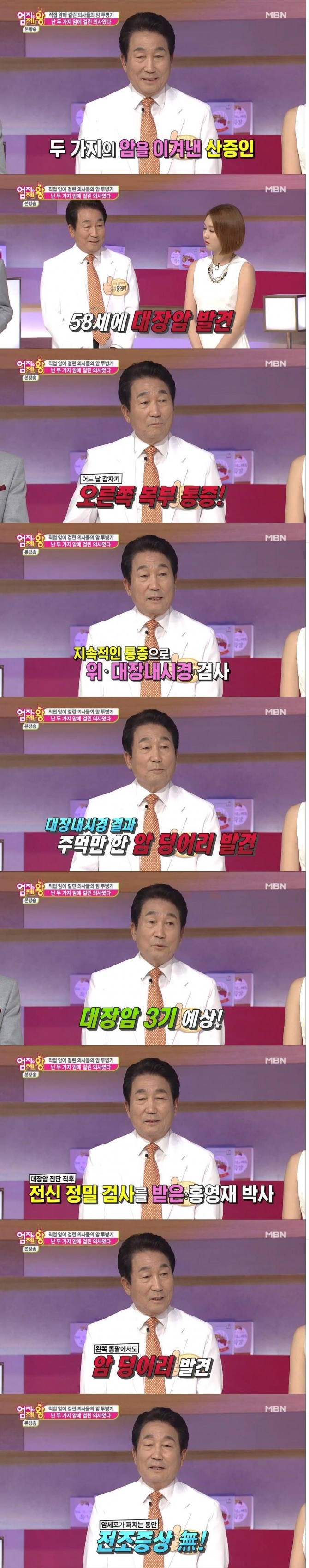 이미지 확대보기이날 방송에는 대장암과 직장암을 극복한 산부인과 전문의 홍영재(73) 박사와 위암을 극복한 소화기 내과 김지 박사가 출연 자신의 암 극복기를 들려줬다.