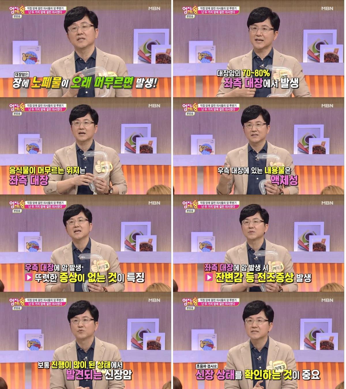 이미지 확대보기서 박사는 또 "음식물이 주로 머무르는 위치는 좌측 대장"이라며 "홍영재 박사의 경우 오른쪽에 대장암이 발생했는데, 이 경우 오른쪽 장을 지나가는 것은 소장에서 넘어간 물변이 지나가는 것으로 증상이 거의 나타나지 않는다"고 설명했다. 그는 "왼쪽 대장에 발생하는 암은 막히는 증상이 있거나 변을 봤는데 또 가고 싶다는 잔변 증상이 나타나서 자각 증상이 있다"며 오른쪽 장과 왼쪽 장에 발병하는 암의 전조증상의 차이점을 설명했다. 대장암은 서구식 식습관도 발병 원인 중의 하나라고 덧붙였다.