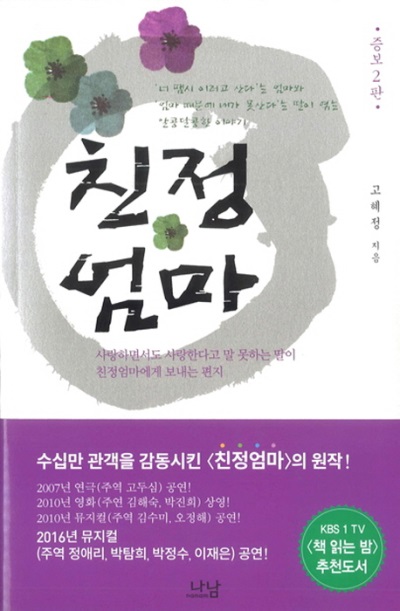 방송작가 고혜정이 쓴 사모곡 '친정엄마'는 전북 정읍 시골마을 가난한 버스기사인 아버지와 못 배운 게 한이지만 4남매를 뼈골 빠지게 키운 에피소드를 통해 정 많은 엄마에게 딸이 보내는 편지같은 글이다.