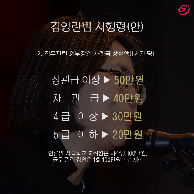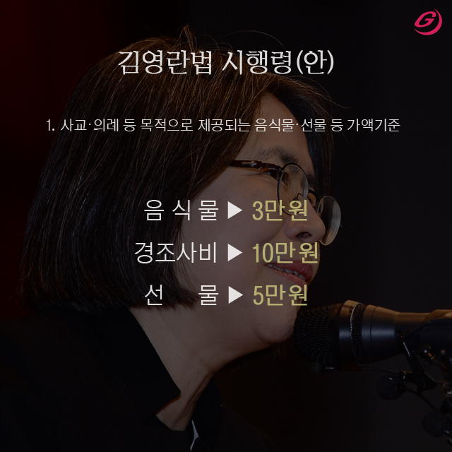 김영란법 시행령에서 사교‧의례 등 목적으로 제공되는 음식물‧선물 등 가액기준은 음식물 3만원, 경조사비 10만원, 선물 5만원이다. 직무관련 외부강연 사례금 상한액은 1시간 당 장관급 이상 50만원, 차관급 40만원, 4급 이상 30만원, 5급 이하 20만원이며, 언론인‧사립학교 교직원은 시간당 100만원, 공무 관련 강연은 1회 100만원으로 제한한다.