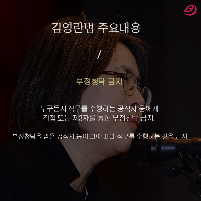 누구든지 직무를 수행하는 공직자 등에게 직접 또는 제3자를 통한 부정청탁 금지하며 부정청탁을 받은 공직자 등이 그에 따라 직무를 수행하는 것을 금지한다.