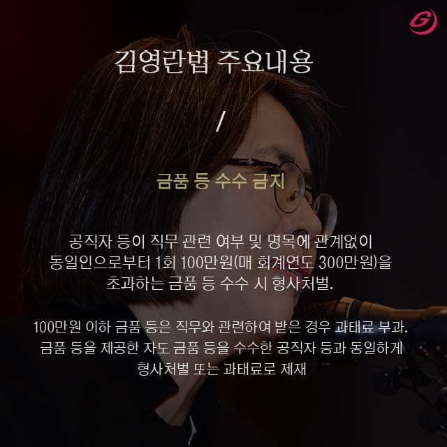 공직자 등이 직무 관련 여부 및 명목에 관계없이 동일인으로부터 1회 100만원(매 회계연도 300만원)을 초과하는 금품 등을 수수 받으면 형사처벌을 받는다. 100만원 이하 금품 등은 직무와 관련하여 받은 경우 과태료를 부과한다. 금품 등을 제공한 자도 금품 등을 수수한 공직자 등과 동일하게 형사처벌 또는 과태료로 제재한다.