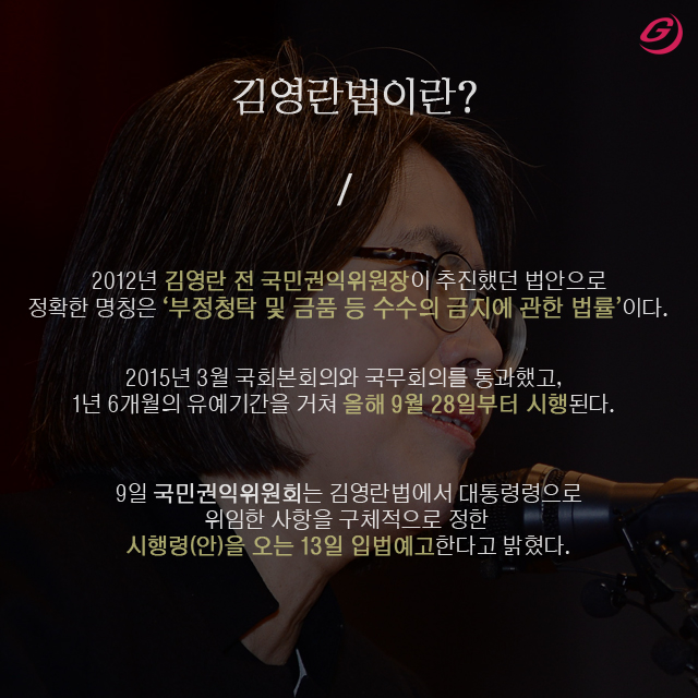 김영란법이란 2012년 김영란 전 국민권익위원장이 추진했던 법안으로 정확한 명칭은 ‘부정청탁 및 금품 등 수수의 금지에 관한 법률’이다. 2015년 3월 국회본회의와 국무회의를 통과했고, 1년 6개월의 유예기간을 거쳐 올해 9월 28일부터 시행된다.