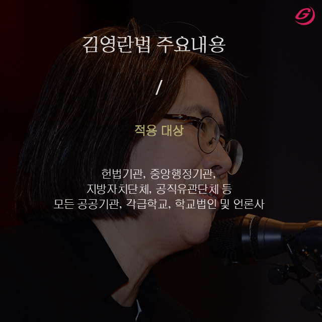김영란법은 헌법기관, 중앙행정기관, 지방자치단체, 공직유관단체 등 모든 공공기관, 각급학교, 학교법인 및 언론사를 적용 대상으로 한다.