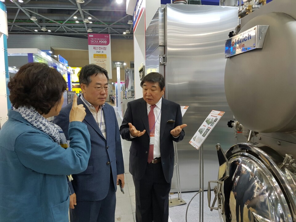 정승 전 식품의약품안전처 처장(사진 가운데)이 이날 개막식 후 육가공설비 전문업체인 협진기계를 방문해 김장호 대표로부터 신제품에 대한 설명을 듣고 있다.
