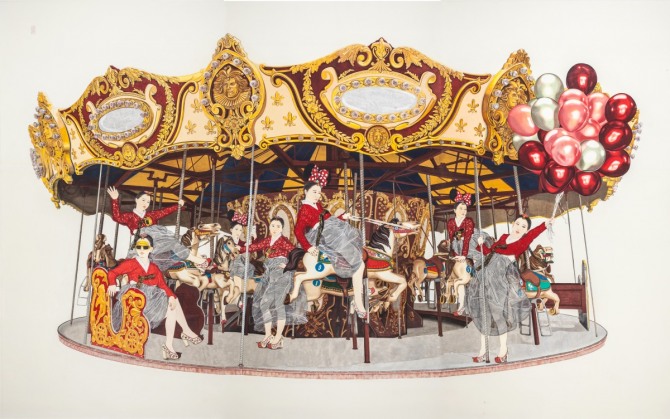 이미지 확대보기김현정은 먹으로 그려진 한복 치마에 한지를 붙여 콜라주한 저고리 차림의 처녀(자신)를 주인공으로 삼는다. 청초, 양순, 지고지순을 떠난 듯 보이는 처녀는 한복을 입고, 퍼질러 앉아 패스트푸드를 즐기거나, 선글라스에 하이힐을 신고 회전목마를 즐긴다. 그녀의 상상은 한복을 입고 자전거를 타거나 말처럼 질주의 본능 보인다. 그녀는 이웃들의 팍팍한 현재적 삶에 아픔을 공유하며 다양한 색깔의 풍선처럼 비상하고 극기하도록 격려한다.