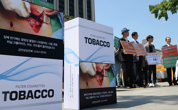 한국금연운동협의회가 지난달 13일 서울시 중구 정부서울청사 앞에서 담뱃갑 경고그림 상단배치 촉구 집회를 벌이고 있다. 사진/뉴시스