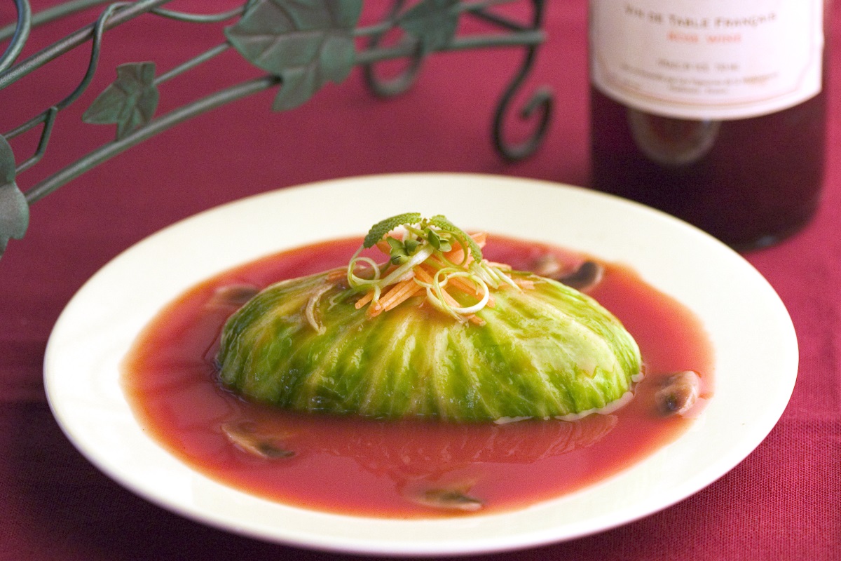 10. 양상추 1잎을 펼치고 가운데 광어를 놓고 보기 좋게 싸서 보기좋게 그릇에 담고 포도주를 뿌리고 170도 오븐에 5분간 익힌다. 토마토소스와 버터소스를 섞어 한번 끓인후 끼얹어 먹는다.