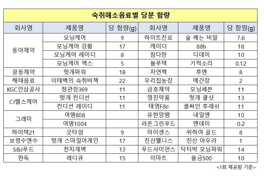 28일 글로벌이코노믹이 전국 편의점에서 판매되고 있는 27개의 숙취해소음료를 조사한 결과, 해태음료 '이태백의 숙취비책'의 1회 당 함량이 22g으로 조사대상 음료 중 가장 많은 설탕을 함유하고 있는 것으로 나타났다. 이어 18g을 함유한 광동제약의 헛개파워와 케이디의 88h가 당 함유량이 높은 것으로 파악됐다. 이 밖에 보령수앤수의 헛개 스마일어게인이 당 함량 17g을 기록했다.