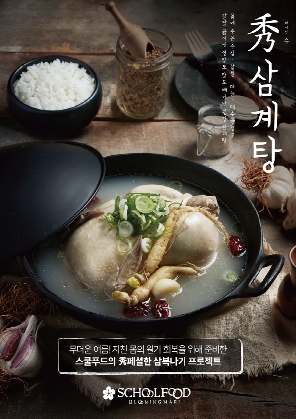 스쿨푸드 마케팅 담당자는 “본격적인 무더위와 장마가 시작되며 입맛과 함께 기력도 없어지는 고객들을 위해 보양식을 한정 메뉴로 선보이게 됐다”며“스쿨푸드 매장은 물론 딜리버리 매장에서도 만나 볼 수 있는 삼계탕으로 건강한 여름을 보내시기 기대한다”고 말했다.