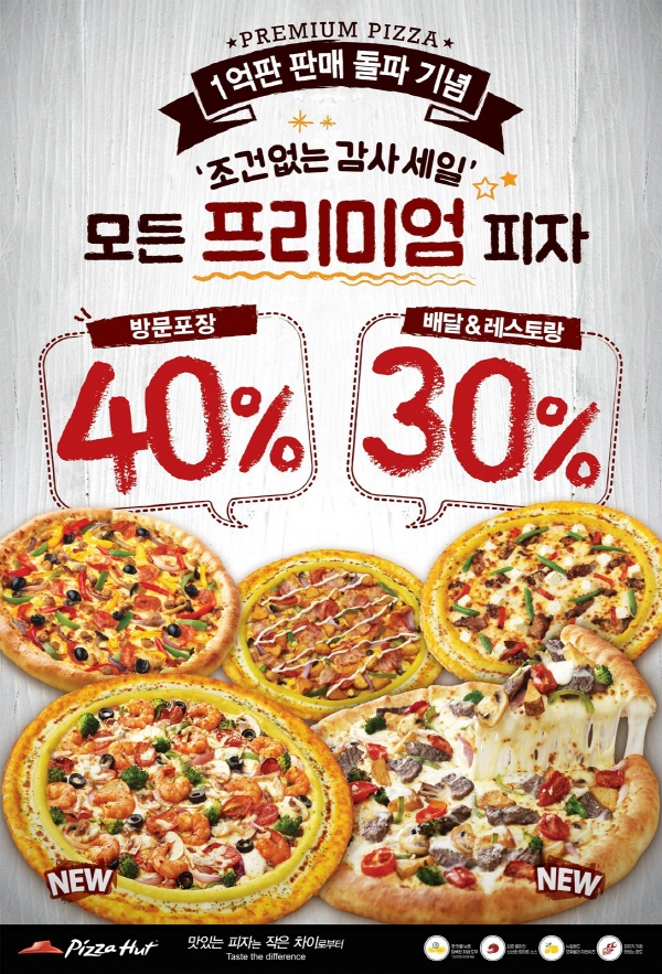 프리미엄 피자 고객 감사 세일은 내일부터 전국 피자헛 매장에서 동시 진행되며, 방문 포장할 경우 40%, 배달 또는 레스토랑 이용 시 30%의 할인을 받을 수 있다.