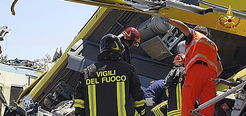 이미지 확대보기현지 소방당국에 따르면 12일 오전 11시30분(현지시간)께 풀리아주 주도 바리 인근의 안드리아와 코라토 사이의 단선 철로에서 통근열차 2량이 정면충돌해 최소 20명이 숨졌다고 밝혔다.
